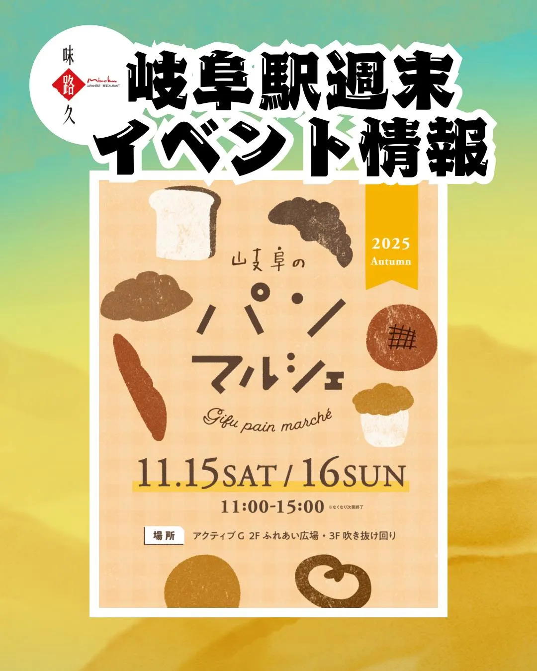 今週末の岐阜駅のイベントは美味しいパン屋さんが大集合🍞✨ 今週末の岐阜駅のイベントは美味しいパン屋さんが大集合🍞✨ランチや夜ごはんはぜひ味路久で和定食や丼をお召し上がりくださいね🤗皆様のご来店心よりお待ちしております💕__________✳️味路久岐阜…